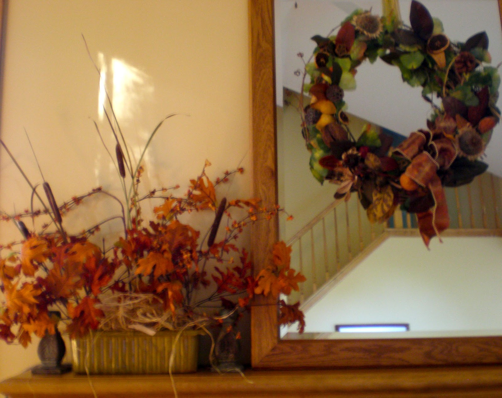 I put this planter with artificial leaves and cattails on the mantel along with a fall themed wreath....I think it will keep Mr. Marvin from jumping up there because there isn't enough room for him to get a foothold....we shall see!