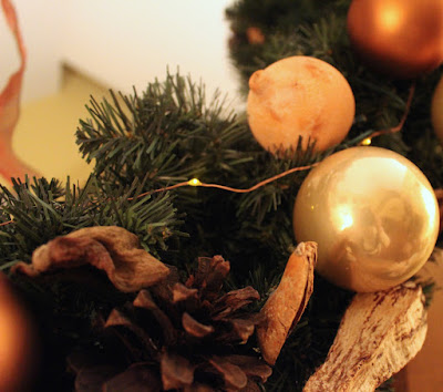 This simple arrangement in the window over the kitchen sink is just greens with dried orange slices and cinnamon sticks. The addition of a string of copper wired twinkle lights adds a special touch.
